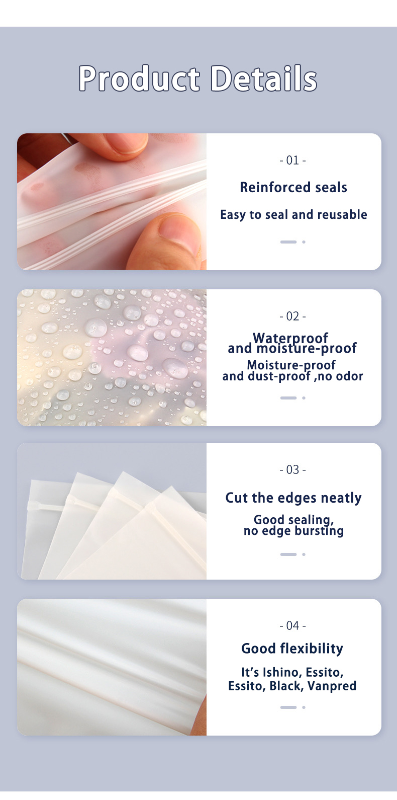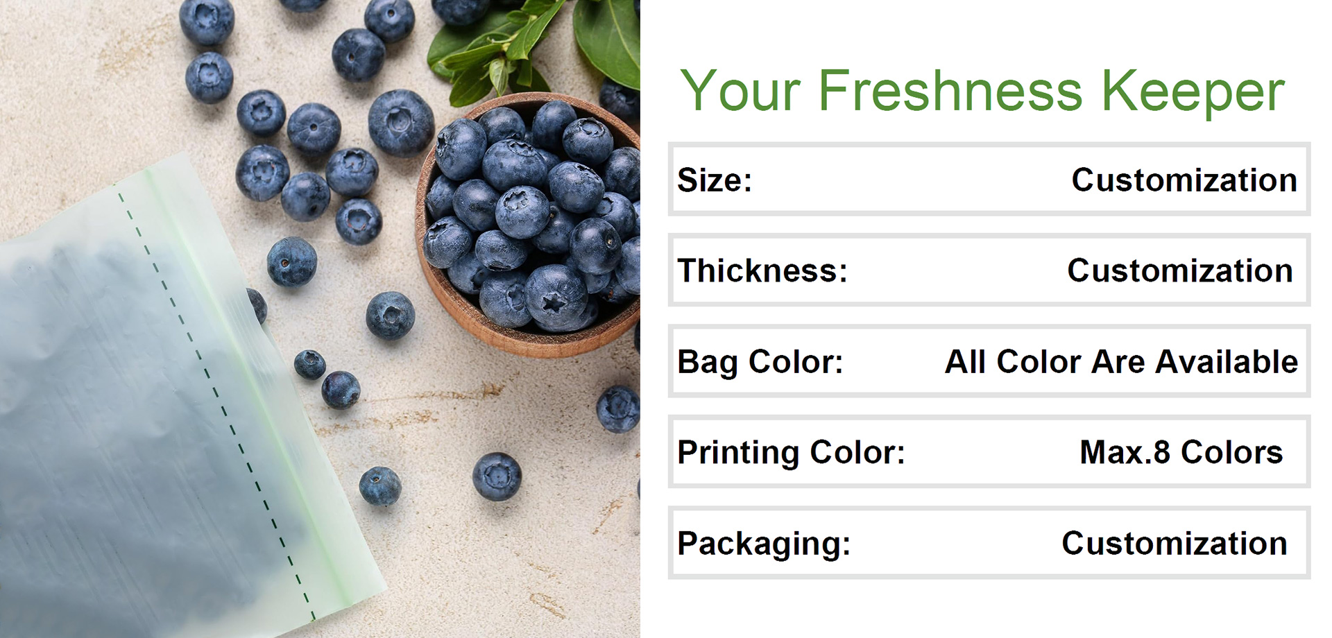 5,Transparent design: high transparency, easy to identify the contents of the bag, reduce the number of times to open the bag, lasting freshness.